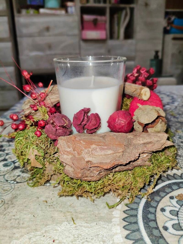 Este centro se basa en un tronco de madera que aporta rusticidad. El césped seco añade suavidad y color dorado, mientras que la corteza de árbol brinda autenticidad.